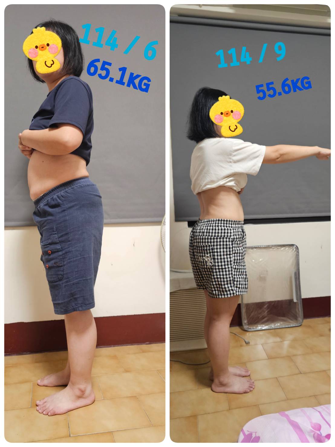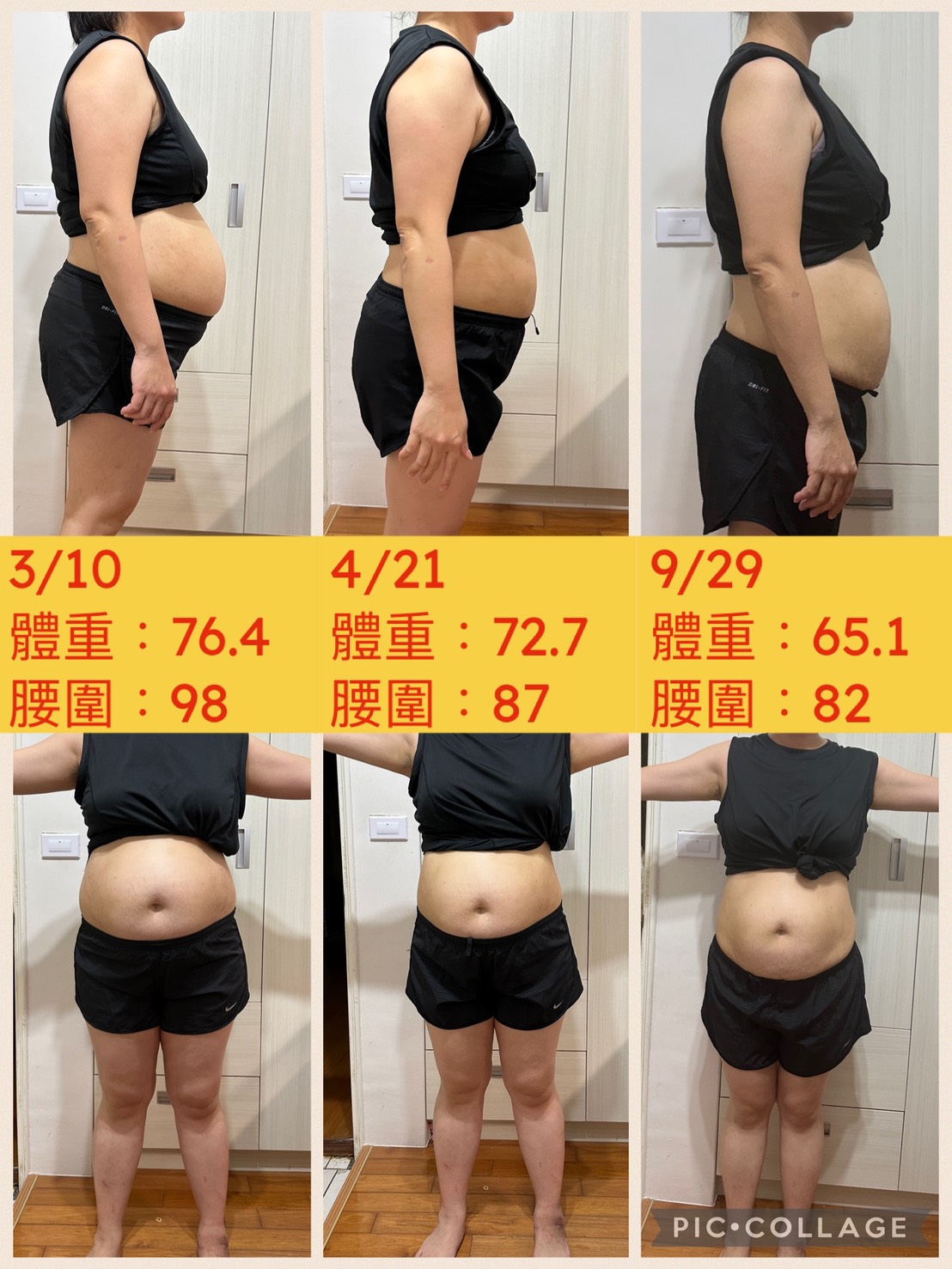 去年4月,參加了營養師的減重課程。開始了自己的減重計劃!剛開始,每天記錄自己的飲食,開始減醣生活,一度讓愛吃澱粉的自己有點困擾,因為我是餐餐都要吃白米飯、麵才有飽足感的人。加上自己年紀關係,代謝慢,每週的體重下降總是不如預期。常常讓自己很洩氣!而減重期間,又遇上5-8月疫情大爆發,大家只能關在家裡無法自由外出,更增加了自己減重的困難度!謝謝營養師這段期間,耐心的陪伴自己檢視每週的飲食、生活,也不斷鼓勵自己,相信自己一定可以做到。1年多的減重生活,自己真的從原本3XL的體型瘦身成XL的尺碼。雖然,離目標還有一半的路程,不過自己會繼續堅持努力下去,一定要瘦回生產前的體態,當個漂亮健康的辣媽咪!